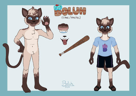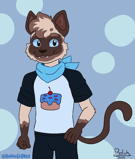 Boluh tem olhos azuis como todo gato dessa raça, um topetinho com mechas cor de caramelo, usa uma camiseta com um símbolo de bolo e um lencinho azul.